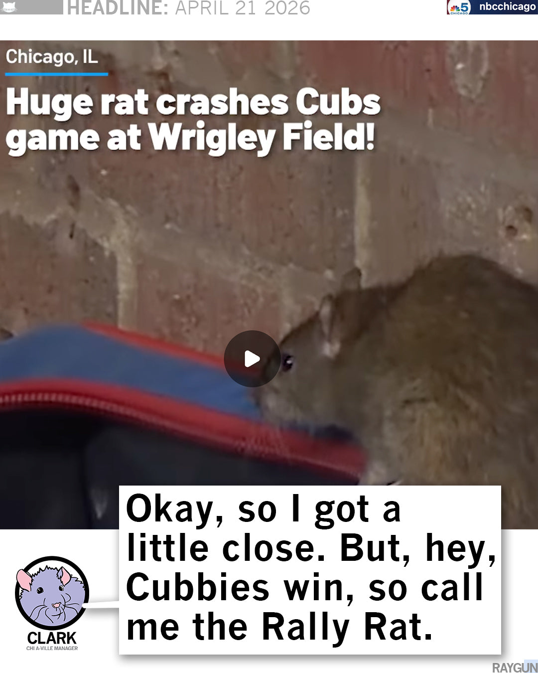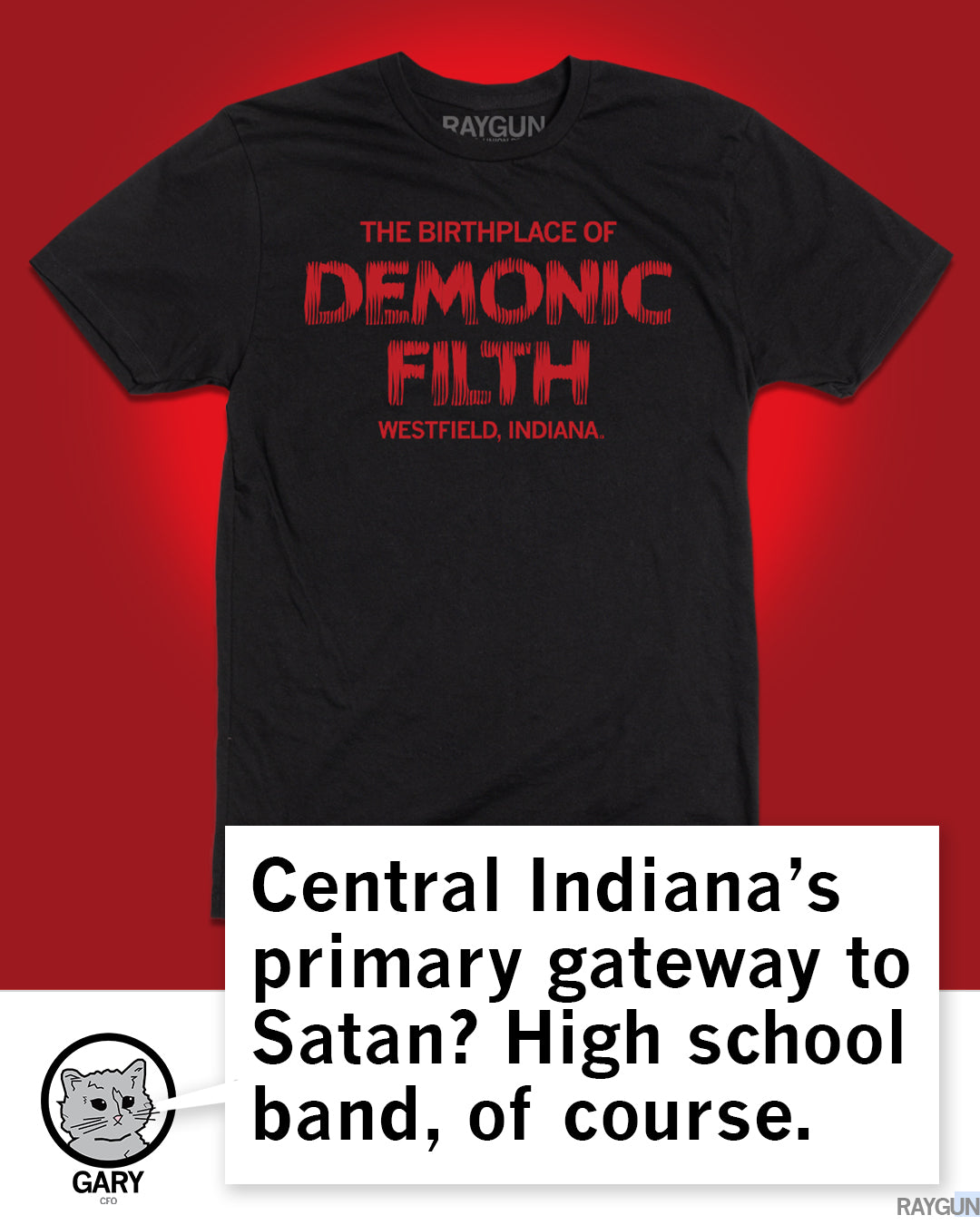 A folded dull white t-shirt with black and bright red ink depicting RAYGUN's cat mascot riding a giant crane through the sky while wearing a pilot helmet and a scarf.