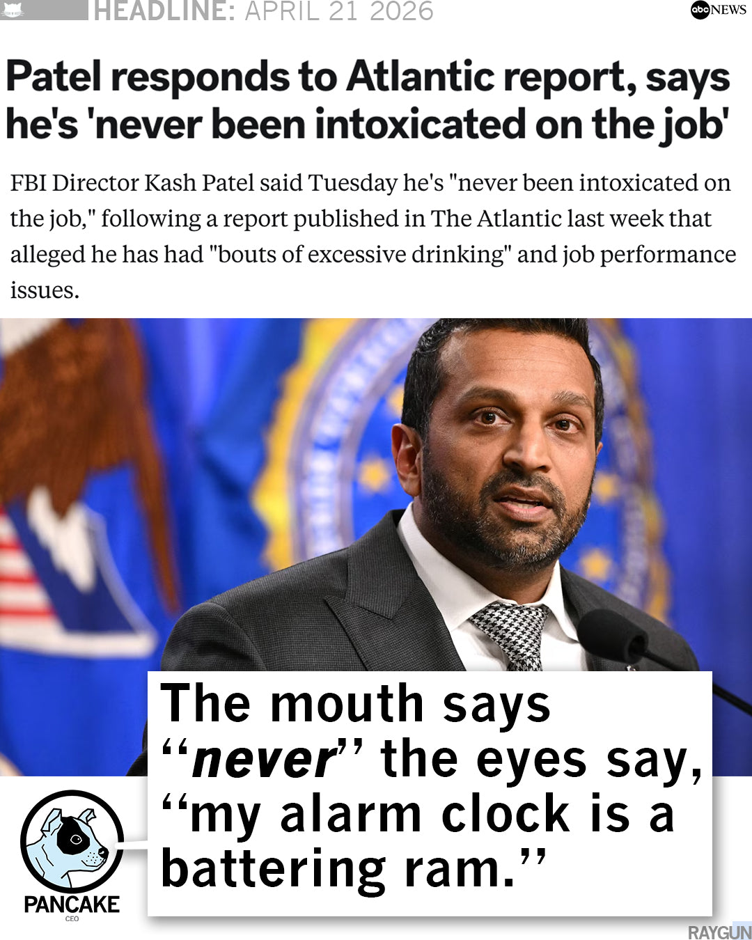 A folded heather navy t-shirt with bright yellow ink illustrating a ribbon around an image of Kash Patel. Text reads
