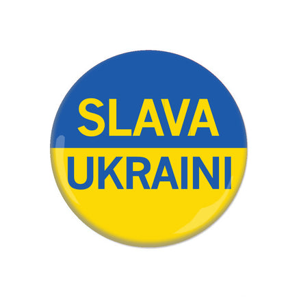 "Light will win over darkness." - Volodymyr Zelenskyy. 100% of the profits will go toward United Help Ukraine. 2.25" Round Metal Button. Designed by RAYGUN and Made by Badge Bomb LLC.