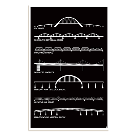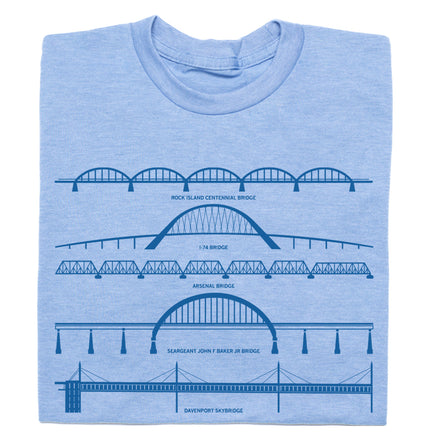 Bridges of the Quad Cities. A Portion of All RAYGUN Sales Raise Money For Organizations That We Support. White Screen Print on a Charcoal T-shirt (50% Combed Ringspun Cotton / 50% Polyester). Cut and sewn sweatshop free. Designed and printed by Union Labor at RAYGUN.