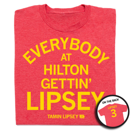 Everybody at Hilton Gettin' Lipsey. Officially licensed with Tamin Lipsey. Golden Yellow Screen Print on a Heather Red T-shirt (60% Combed Ringspun Cotton / 40% Polyester ). Cut and sewn sweatshop free. Designed & printed by Union Labor at RAYGUN.