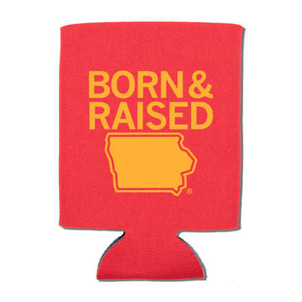 IA: Born & Raised. Golden yellow plastisol ink print on black fade-resistant polyester covered scuba foam. Designed by RAYGUN. Imported and printed in the USA.