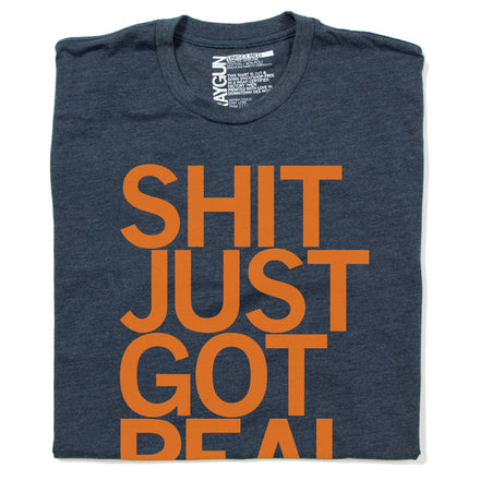 Shit Just Got Real! Gold plastisol ink print on black fade-resistant polyester covered scuba foam. Designed by RAYGUN. imported and printed in the USA.