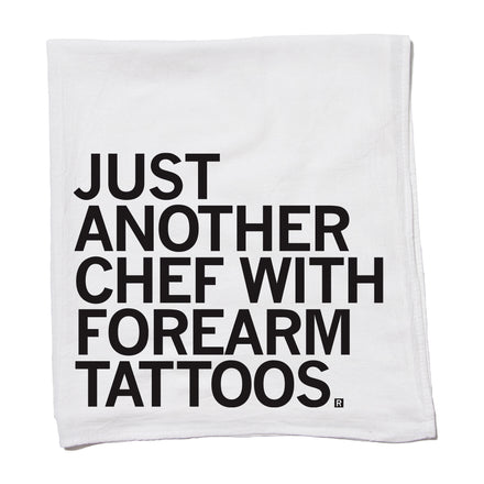 Just Another Chef With Forearm Tattoos. A Portion of All RAYGUN Sales Raise Money For Organizations That We Support. White Screen Print on a Charcoal T-shirt (50% Combed Ringspun Cotton / 50% Polyester). Cut & sewn sweatshop free. Designed and Printed by Union Labor at RAYGUN.