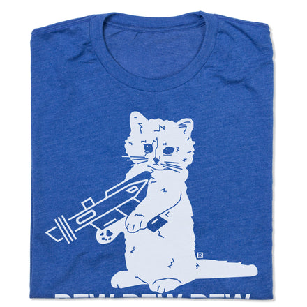 Gary the Cat goes Pew Pew Pew. A Portion of All RAYGUN Sales Raise Money For Organizations That We Support. Black Screen Print on a Heather Grey T-shirt (65% Polyester / 35% Combed Ringspun Cotton). Cut and sewn sweatshop free. Designed and printed by Union Labor at RAYGUN.
