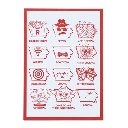 The Many Faces of Iowa. Red soy-based ink print on 16 oz. pint glass. Lead free, fade resistant and dishwasher safe. Designed by RAYGUN and Printed by PyroGraphics in Des Moines, IA.
