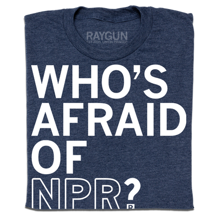 America Needs Public Media despite what the government may think. Officially licensed with NPR, meaning a portion of sales goes to support programming. More RAYGUN designed or printed products are available at NPR.org.