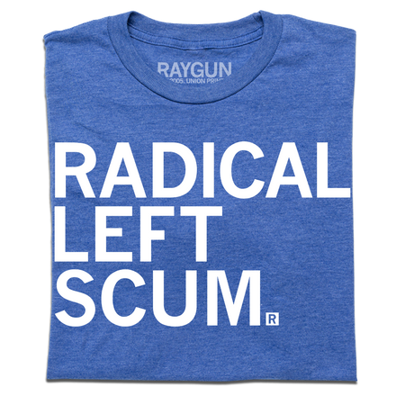 Radical Left Lunatic. A Portion of All RAYGUN Sales Raise Money For Organizations That We Support. Lite Blue Screen Print on a Heather Royal T-shirt (50% Combed Ringspun Cotton / 50% Polyester). Cut & sewn sweatshop free. Designed and Printed by Union Labor at RAYGUN.
