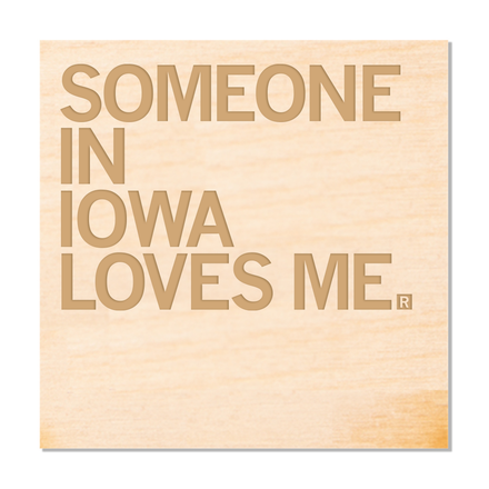 Someone In Iowa City Loves Me. Laser Etch on 1/8 inch Baltic Birch wood. 4x4" clear sealed and back stained black. Designed by RAYGUN and printed by Union Labor at RAYGUN.