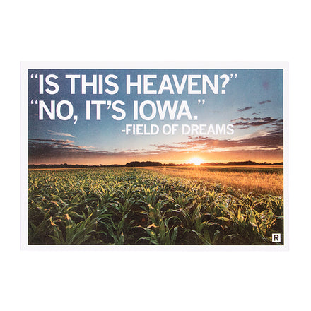 "Is This Heaven?" "No, It's Iowa." - Field of Dreams. A Portion of All RAYGUN Sales Raise Money For Organizations That We Support. White Screen Print on a Black T-shirt (100% Combed Ringspun Cotton). Cut and sewn sweatshop free. Designed and printed by Union Labor at RAYGUN.