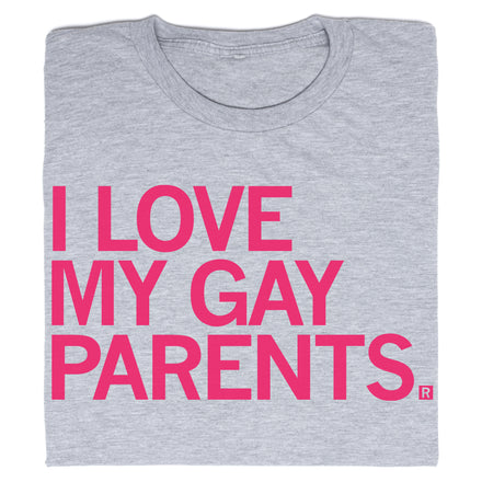 I Love My Gay Parents. White Screen Print on a Heather Red T-shirt (60% Combed Ringspun Cotton / 40% Polyester). Cut and sewn sweatshop free. Designed and printed by Union Labor at RAYGUN.