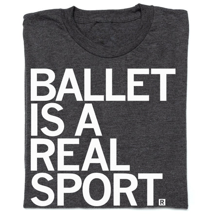 Ballet is a Real Sport. Made in partnership with Ballet Des Moines. White Screen Print on a Charcoal T-shirt (60% Combed Ringspun Cotton / 40% Polyester). Cut and sewn sweatshop free. Designed & printed by Union Labor at RAYGUN.