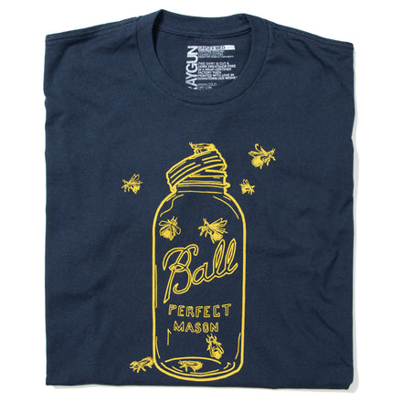 Firefly Mason Jar. Yellow Screen Print on a Heather Navy T-shirt (60% Combed Ringspun Cotton / 40% Polyester). Cut and sewn sweatshop free. Designed by and Licensed from Twice Studios here in Iowa.