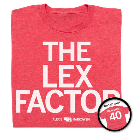 Alexis Markowski: Lex and 1. Approved by Alexis Markowski. A Portion of All RAYGUN Sales Raise Money For Organizations That We Support. Brite Red Screen Print on a Heather Grey T-shirt on Front, Back and Sleeve (50% Combed Ringspun Cotton / 50% Polyester). Cut and sewn sweatshop free. Designed and printed by Union Labor at RAYGUN.
