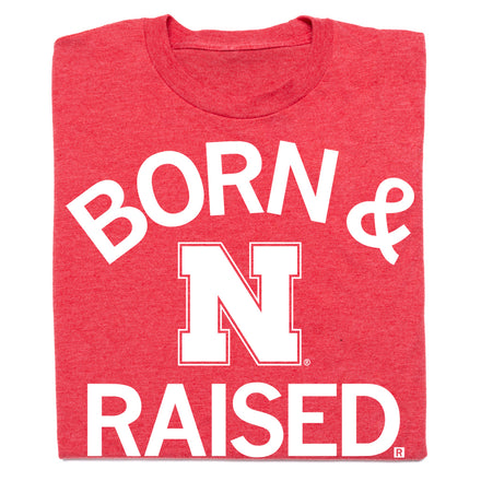 Nebraska Born and Raised. A Portion of All RAYGUN Sales Raise Money For Organizations That We Support. White Screen Print on a Heather Red T-shirt (50% Polyester/ 50% Combed Ringspun Cotton). Cut and sewn sweatshop free. Designed and printed by Union Labor at RAYGUN.