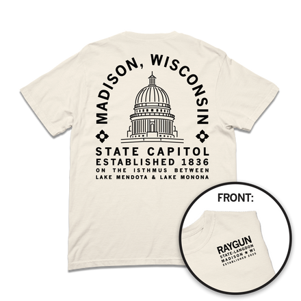 Designed and Printed by Union Labor at RAYGUN. Cut & sewn sweatshop free. A Portion of All RAYGUN Sales Raise Money For Organizations That We Support.