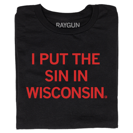 • "I Put The Sin In Wisconsin" printed in red ink on a black sweatshirt