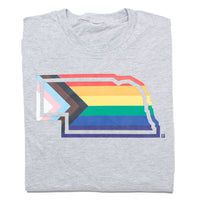 Nebraska has Pride. A Portion of All RAYGUN Sales Raise Money For Organizations That We Support. Heat Transfer on a Light Grey T-shirt (90% Combed Ringspun Cotton / 10% Polyester). Cut and sewn sweatshop free. Designed and printed by Union Labor at RAYGUN.