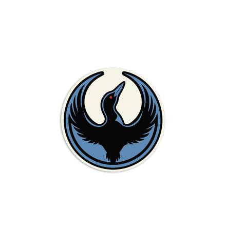 • A circular black sticker with the Rebel Loon Alliance Logo. It uses a loon with outstretched wings to mimic the shape of the Star Wars Rebel Alliance Logo. The loon is printed blue & black with red eye.