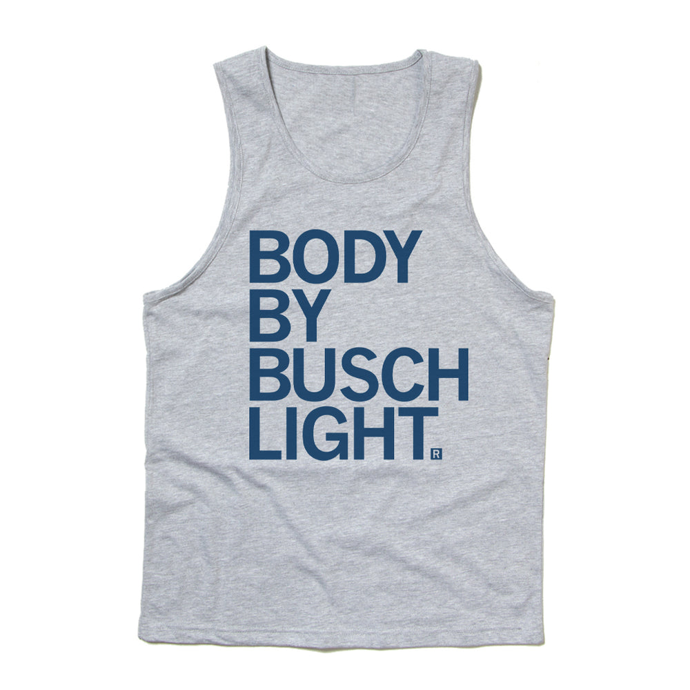 Body By Busch Light. A Portion of All RAYGUN Sales Raise Money For Organizations That We Support. Black Screen Print on a Heather Grey Tank Top (90% Combed Ringspun Cotton / 10% Polyester). Cut and sewn sweatshop free. Designed and printed by Union Labor at RAYGUN.