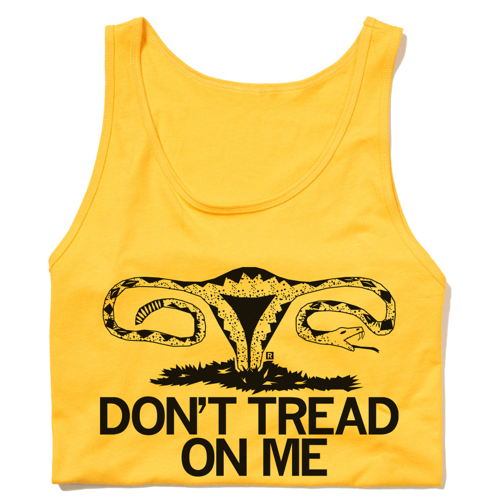 Uterus: "Don't Tread On Me!" A Portion of All RAYGUN Sales Raise Money For Organizations That We Support. Black Screen Print on a Gold Tank Top (100% Combed Ringspun Cotton). Cut and sewn sweatshop free. Designed and printed by Union Labor at RAYGUN.