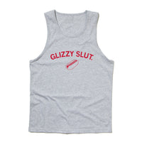 Glizzy Slut. A Portion of All RAYGUN Sales Raise Money For Organizations That We Support. Red Screen Print on a Heather Grey Tank Top (90% Combed Ringspun Cotton / 10% Polyester). Cut and sewn sweatshop free. Designed and printed by Union Labor at RAYGUN.