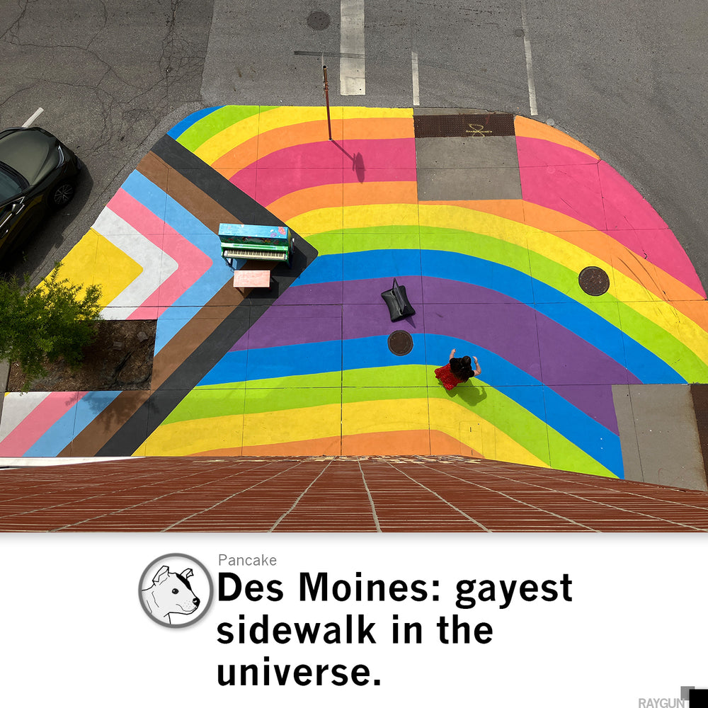 RAYGUN Des Moines is at the corner of Sunshine and Rainbows in the East Village. A portion of sales go to Capital City Pride, who helped to organize the painting of our intersection by artists Cat Rocketship and Dani Awesome. Heat Transfer Print on a White T-shirt (100% Combed Ringspun Cotton). Cut & sewn sweatshop free. Designed and Printed by Union Labor at RAYGUN.