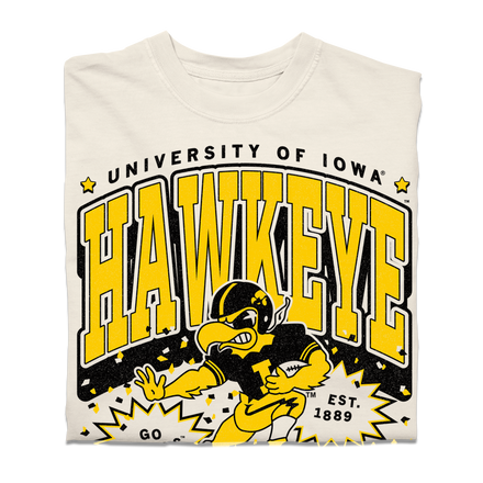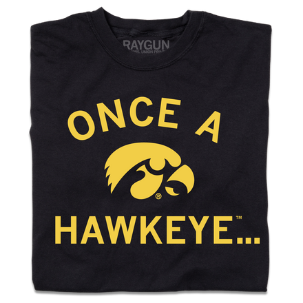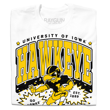 Lil Iowa Hotguy. A Portion of All RAYGUN Sales Raise Money For Organizations That We Support. Gold Screen Print on a Black Bib (100% Cotton). Cut and sewn sweatshop free. Designed and printed by Union Labor at RAYGUN.
