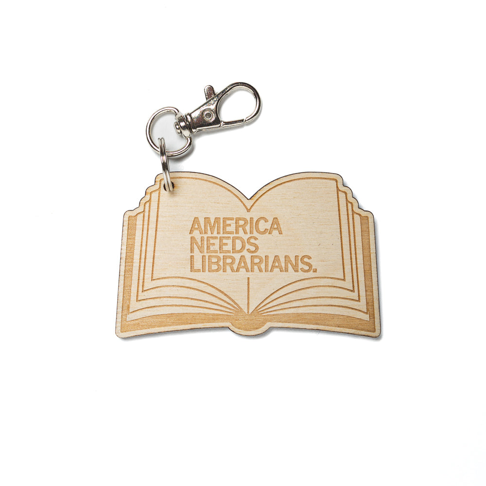 America Needs Librarians Open Book Wood Keychain. A Portion of All RAYGUN Sales Raise Money For Organizations That We Support. Laser Etch on Baltic Birch Black Stain Back Wood Keychain. 2.75" x 1.75" x .125" thick. Designed and manufactured by union labor at RAYGUN.