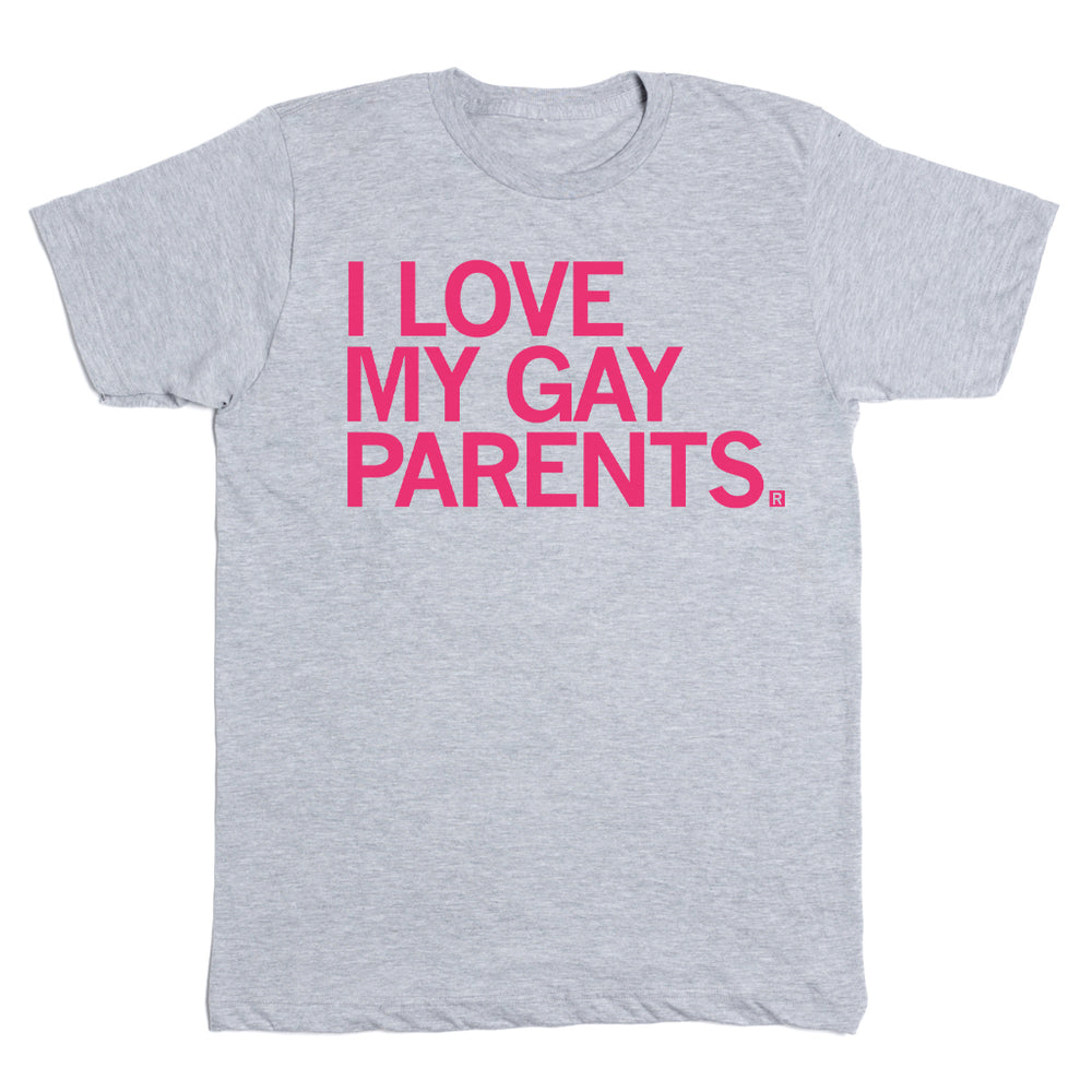 I Love My Gay Parents. A Portion of All RAYGUN Sales Raise Money For Organizations That We Support. Aura Pink Screen Print on a Light Grey T-shirt (90% Combed Ringspun Cotton / 10% Polyester). Cut and sewn sweatshop free. Designed and printed by Union Labor at RAYGUN.