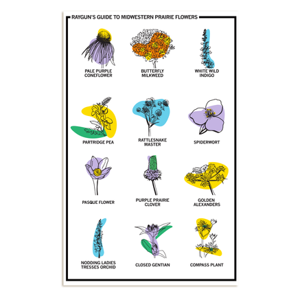 RAYGUN's Guide To: Midwestern Pollinators. RAYGUN is a monthly supporter of the ELPC Midwest, Iowa Environmental Council, and many other pollinator-friendly gardens. 11" x 17" Poster Designed by RAYGUN and printed digitally by Union Labor at Garner Printing in Des Moines. Paper milled in Wisconsin.