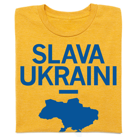 Stand with Ukraine. 100% of the profits will go toward United Help Ukraine. Gold Screen Print on a Heather Royal Blue T-shirt (50% Combed Ringspun Cotton / 50% Polyester). Cut and sewn sweatshop free. Designed and printed by Union Labor at RAYGUN.