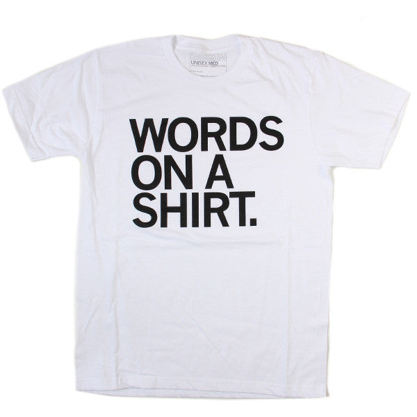 Words On A Shirt. A Portion of All RAYGUN Sales Raise Money For Organizations That We Support. Black Screen Print on a White T-shirt (100% Combed Ringspun Cotton). Cut and sewn sweatshop free. Designed and printed by Union Labor at RAYGUN.